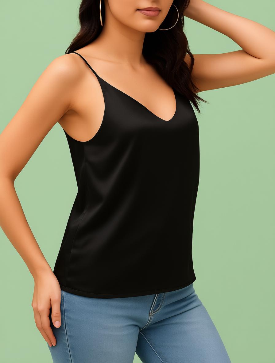 silk satin camisole, women's cami top, spaghetti strap vest, satin camisole top, V-neck cami, layering top, luxury camisole, premium satin top, women's blouse, inclusive sizing, M XL 2XL camisole, black cami top, Morydal camisole, wardrobe essential.